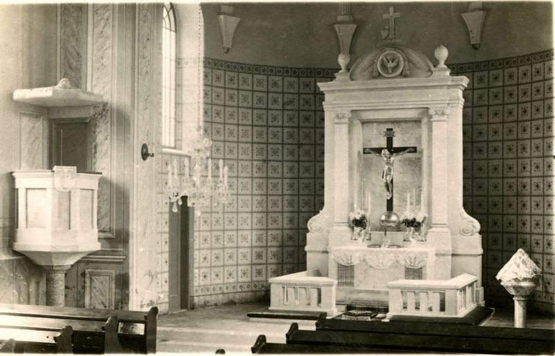 Márvány keresztelőkútja 1883-ból, míg neoklasszicista, Besztercebányán készült főoltára 1933-ból való. Az épület tornyát – amely kissé meghaladja a főhomlokzat síkját – a szerdahelyi építész, Wyberál Gyula (a járásbíróságot, vagy a régi temetői Kriha-kápolnát építő Wyberál József fia) építette 1938-ban a templomhoz. A szakrális hely szószékét ugyancsak ő adományozta a templomtorony építésének az idején a közösségnek.